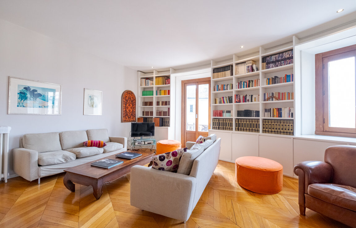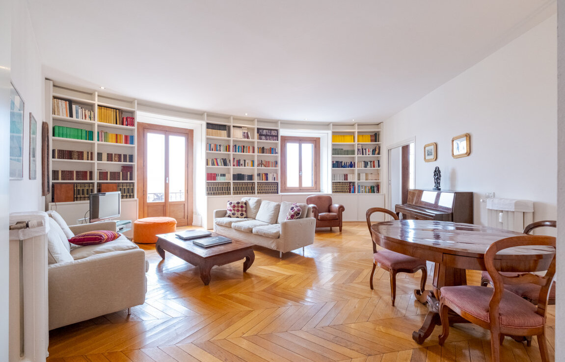Varcata la soglia, un ampio ingresso accoglie gli ospiti conducendoli verso un salone doppio di alta rappresentanza. Qui, il pregiato parquet posato a spina di pesce e gli alti soffitti donano un respiro d’altri tempi e una sobria eleganza.